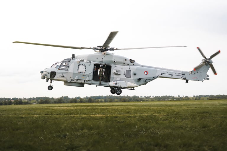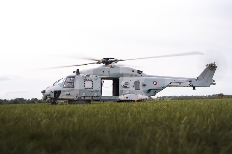 Sculpté par la lumière du tarmac et le grondement des turbines, le NH90 Caïman de la flottille 31 s’impose comme une silhouette de puissance et de précision.